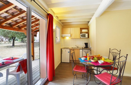The holiday complex in southern France, northwest of Nîmes, comprises a total of 90 cosily furnished terraced houses, each with its own terrace. The typical regional buildings are located on a 6-hectare site. In addition to the outdoor pool (open depending on the weather) with a sun terrace, guests can use the heated indoor pool, a fitness room, a sauna, a tennis court and table tennis (partly for a fee). Animation for the little ones is offered free of charge in high season. Note: Wifi at the reception of the complex free of charge, in the residential units for a fee. In Sauve, a small medieval town at the foot of the Cévennes, about 40 km from Nîmes, there is a lot to discover, such as an 11th century bridge, the city walls, medieval towers. Explore the area by hiking or cycling, or take a trip to Nîmes.