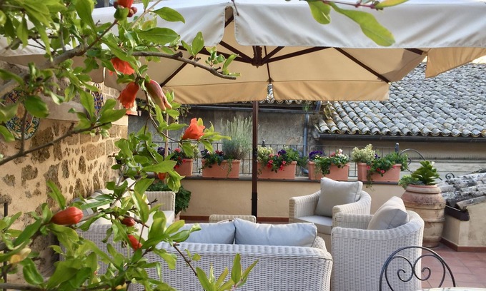 From the second floor you can reach the magnificent terrace on the rooftops of Orvieto, which extends the living space to the outdoors. You will experience a piece of paradise, between colorful flowers and small trees in terracotta pots. The perfect spot for breakfast, lunch or dinner, the beautifully furnished outdoor dining terrace and seating area ensure our guests can enjoy the wonderful and unique Umbrian light and balmy summer evenings. Spring, early summer and autumn are exceptionally lovely in Umbria and so this terraced garden can be enjoyed throughout the seasons. Two comfortable sofas and armchairs, a lava stone table, wrought iron chairs, sun loungers, pillows and a large umbrella furnish the terrace. Everything about this paradisiacal terrace appeals to the senses: the fragrance of cascading flowers, the waft of hilltop breezes while sunbathing on a comfortable sun lounger... The terrace is equipped with lighting, so it can also be enjoyed at night.
