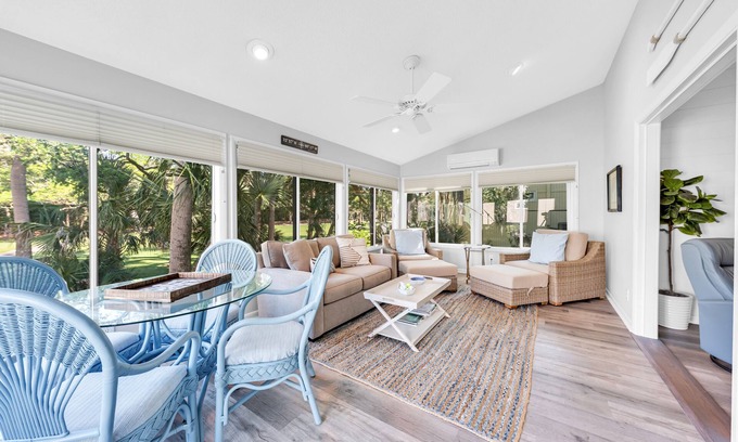 You'll be greeted by an open floor plan perfect for gathering friends and family. The kitchen is updated and well equipped with granite counter tops & stainless appliances Just off the kitchen is the dining area with table seating for 6. Adjacent to the dining area is the family room with vaulted ceiling and ceiling fan. Comfortable seating is arranged to take advantage of the 65" Smart TV. Just beyond the family room is the 4 season sun room with spectacular golf course views. This wonderful room is air conditioned and filled with natural light. Enjoy a snack at the glass top table with seating for 4 or just relaxing in the conversation seating area.