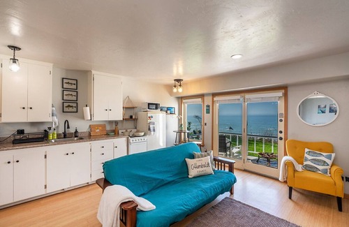 Enter your private gate code to this 2 acre custom estate on the cliffs of the sea. Long driveway leading to a spectacular 3 unit property with gorgeous views of the ocean and surrounding greenery and creek. The oversized 1 bedroom unit is ground level with a deck for private outdoor space. The unit is warm and inviting with large windows showcasing all of the amazing views. Wall heater in living room & small office space in front entry room. Cute & functional kitchen great for cooking. Beautiful, safe & cozy beach studio is waiting for you.