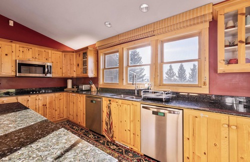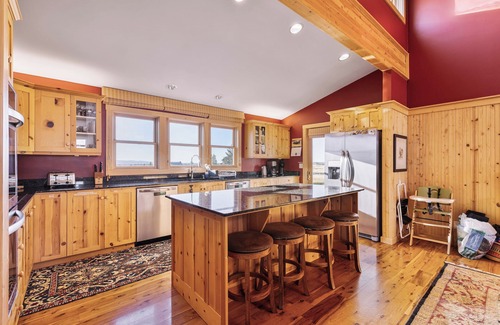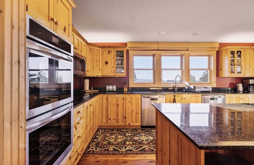 The kitchen and dining area is open and connected to the living room, making it easy for groups to gather together. The fireside dining room table can seat up to 10 comfortably. The cook's kitchen is well stocked and includes double ovens and double dishwashers. There's tons of counter area, with granite tops and a large island and breakfast bar.