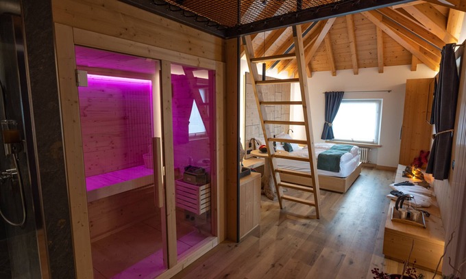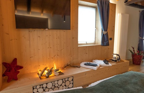 The Teverone Suites is a beautiful structure located in Lamosano, in Alpago, surrounded by the Cansiglio woods and a few kilometers from Lake Santa Croce. The structure has been completely renovated with taste and attention to detail. Each room has a sauna, Jacuzzi, electric fireplace and all the comforts for a romantic and wellness stay. Ideal for a couple looking for relaxation and a romantic place to celebrate an anniversary. On the ground floor of the building a Bar Restaurant-pizzeria offers the opportunity to have lunch or dinner tasting typical Alpago products.The Chamois room consists of a comfortable double bed with LCD TV and walk-in closet. There is a small table with chairs and an electric fireplace. The chromotherapy sauna is large and comfortable. The bathroom has a toilet. bidet and large shower box. A loft with a large net where you can lie down comfortably is available as a relaxation area. Outside, a beautiful and large terrace with a large heated whirlpool tub with chromotherapy and a fireplace with bench for authentic moments of well-being and romanticism in the open air and illuminated by the glow of the stars. Possibility to have breakfast in the restaurant below. There is Wi-Fi internet connection and car parking in the external square. The room is ideal for a couple looking for relaxation and well-being in a refined and romantic setting.