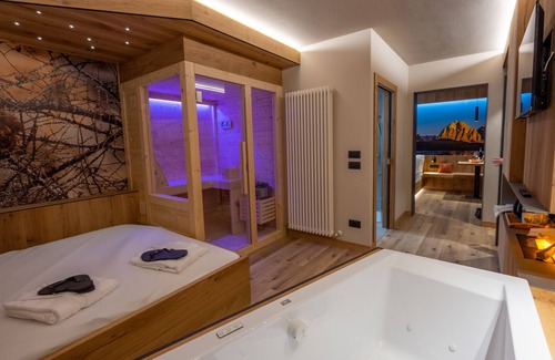 The Teverone Suites is a beautiful structure located in Lamosano, in Alpago, surrounded by the Cansiglio woods and a few kilometers from Lake Santa Croce. The structure has been completely renovated with taste and attention to detail. Each room has a sauna, Jacuzzi, electric fireplace and all the comforts for a romantic and wellness stay. Ideal for a couple looking for relaxation and a romantic place to celebrate an anniversary. On the ground floor of the building a Bar Restaurant-pizzeria offers the opportunity to have lunch or dinner tasting typical Alpago products.The squirrel room consists of a comfortable double bed with LCD TV, walk-in closet and a corner with table and bench. The living and relaxation area consists of a sauna and a large whirlpool tub, both with chromotherapy, an electric fireplace, an LCD TV and a relaxation corner with a comfortable and large water mattress. The bathroom has a toilet, bidet and a large shower box. Possibility to have breakfast in the restaurant below. There is Wi-Fi internet connection and car parking in the external square. The room is ideal for a couple looking for relaxation and well-being in a refined and romantic setting.