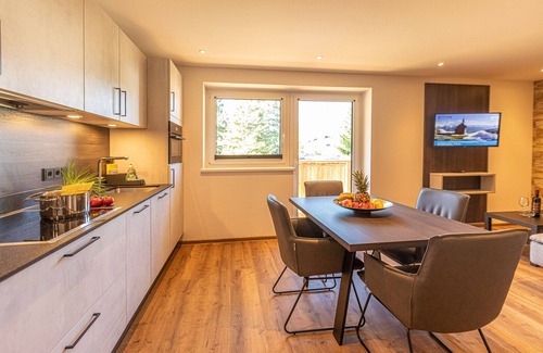 Superior Apartment. Mountain view, balcony. 1 bedroom. 1 bathroom. 50sqm. 1 - 4 person. Enjoy your holiday in Zell am See in our Tevini Boutique Suites - Apartment Earth and book the best possible price directly at the owner.NEW!! Tevini Boutique Suites welcome guests from May 2021. State-of-the-art equipment paired with alpine flair makes the "Earth" holiday apartment an oasis of well-being that is second to none. At the foot of the Schmittenhöhe, directly opposite the AreitXpress, Tevini Boutique Suites are the ideal starting point for both summer and winter holidays.The apartment is equipped with everything a relaxing holiday needs: on 50m² there is a bedroom with a double bed and a living room with a double sofa bed for a total of 4 people. A modern bathroom with shower is a matter of course.Of course, our guests use free internet and a parking lot. We also have a ski and bike storage room. The "Earth" apartment has a balcony as well as central heating and a Smart TV.The eat-in kitchen with electric hob is also fully equipped: fridge and freezer, microwave, oven, dishwasher, dishes / cutlery, cooking utensils, a coffee machine, as well as toaster and kettle are part of our standard equipment.The following are within walking distance: the Areit cable car (300m), the lake (600m), a supermarket (50m), the train station and the city center (but 2.5km). The golf course (1km) and Salzburg Airport (75km) can be easily reached by car or public transport.