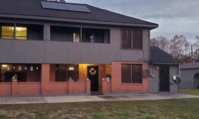 A Texas themed retreat just 5 minutes off of I-10 near the San Jacinto River. Solar powered with an EV charger and a back up battery earth friendly unit. Decorated with unique Texas antiques for a Houston centric stay. Features a fully equipped eat-in kitchen, pet friendly.