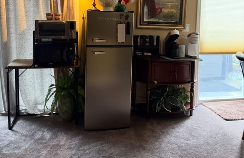 Start your day with fresh espresso or Keurig coffee, then relax on your private deck with a BBQ for easy outdoor meals. The kitchenette includes a full fridge, microwave, toaster, etc. espresso machine, and Keurig—ideal for light cooking (note: no stove or oven).