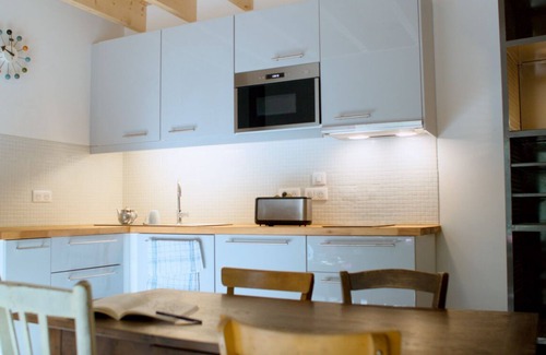 The kitchen is equipped with a stovetop and a refrigerator, as well as a coffee maker, an electric kettle, and a microwave. Bathroom amenities include towels, toilet paper, and soap. Other amenities include a BBQ grill, bed sheets, heating, and change of towels on request.