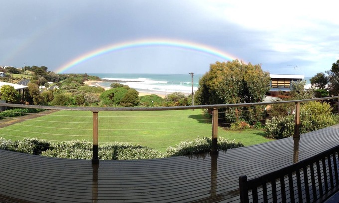 Massive timber deck, with 5 burner gas BBQ, drinks fridge, outdoor dining & deck chairs. Enjoy meals outdoors with some of the best beach views along the Great Ocean Road. Hand feed Cockatoos, Rosellas and King Parrots at the same time.