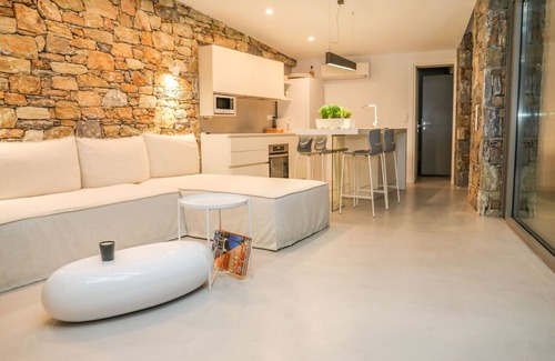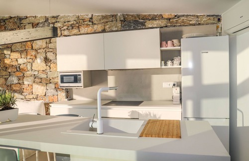 In this caved stylish open house the white simplicity of the interior unifies with the outdoor areas. This Villa is providing also the possibility to enjoy the Aegean from the king sized beds located in the bedrooms as well as from the living room or the kitchen. You can even enjoy the same view from the hot tub that is sculptured in the en-suite bathroom while having a relaxing time.