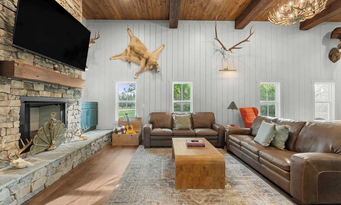 The 1900 Farmhouse Retreat seamlessly blends historic character with modern amenities. The main house features a decorative fireplace, tall ceilings, original architectural details, and all the comforts needed for a relaxing stay. With 2 king bedrooms, 2 queen bedrooms, 3 full bathrooms, and a fully stocked kitchen, this home is perfect for large families or groups. The clawfoot tub in one of the bathrooms is perfect for a relaxing soak, while the large porches offer the ideal setting for morning coffee or evening conversations under the stars. Each bedroom is equipped with a smart TV for your entertainment, and the 78-acre property offers plenty of space for outdoor games, stargazing, or simply enjoying the quiet of rural life.