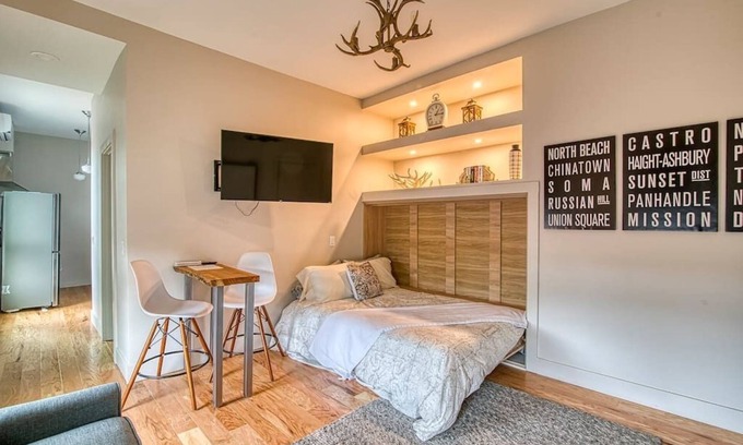 Guest favorite! Spotless and perfectly located studio apartment. This deluxe experience offers every convenience - a new premium mattress, 50" flat screen TV, fully equipped kitchen with high-end appliances, sleek furnishings, and secure entry.