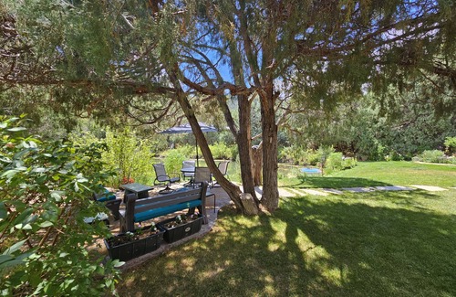 The 5 Star Casita is an elegant, authentic adobe structure attached to the main house on five acres, surrounded by junipers and native grasses, nestled in Taos Canyon on the scenic Enchanted Circle drive - yet only 5 miles from historic Taos Plaza. Truly a four-season experience, with vibrant spring and summer gardens and golden autumn cottonwoods. The 5-acre property has a private trail culminating in a canyon-view bench before it joins the national forest. A rustic bridge crosses the Rio Fernando. A 1/3-acre pond reflects the landscape. Many guests are now staying longer in Taos and wish to work from "home". We have reliable internet and there is a collapsible computer desk in the Casita. The location is 18 miles to Angel Fire and 24 miles to Taos Ski Valley and is very convenient to hiking, biking, and all the shopping, dining and culture Taos has to offer. There is covered parking and garage next to the Casita entrance. Radiant and wall heated. Saltillo and Italian stone tile flooring and a large wood burning kiva in the living room. Washer/dryer, iron and ironing board are on the premises. Thick adobe walls, trees, and cross ventilation keep it naturally cool in summer.