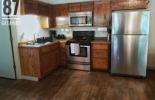 Cabin #2 is situated in the center of 87Getaway with one bedroom and one bath. The bedroom sleeps two with a queen sized bed. Stainless steel appliances contrast the feel of being in nature. Under a blanket of trees sits your perfect getaway with a patio, BBQ grill, and a fire pit for a real feeling of camping.