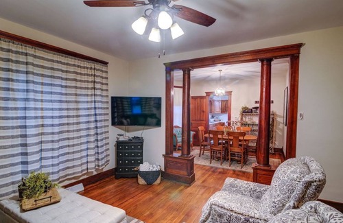 Beautiful three bedroom bungalow with beautiful original woodwork and built in!! Enjoy fully stocked kitchen with coffee bar. Washer and dryer on back porch!! Enjoy enclosed front porch with windows and swing chairs.