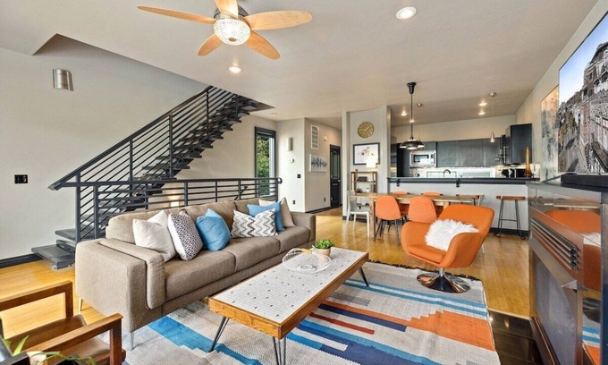 Our townhome is recently designed and decorated to be a sleek & modern showstopper with the utmost comfort. Wander through our 3-story townhome & enjoy beautiful details & color with mid-century modern accents and plenty of live greenery.