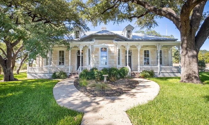 Step into history at this lovingly restored 1880s ranch estate in Lampasas, Texas. Nestled on 18 acres, the property features a stately historic home and a charming guest cottage, both surrounded by sweeping lawns, century-old oak trees, and endless Hill Country skies. With wide porches, cozy patios, and glowing sunsets, this is the perfect setting for gathering with friends and family or enjoying a peaceful evening under the stars.