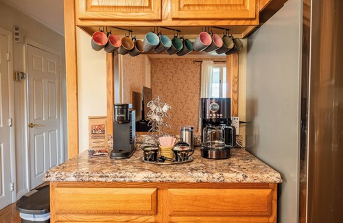 Our spacious kitchen is fully equipped with utensils and cooking supplies, ready for you to create delicious meals. Enjoy your morning coffee at the coffee bar, featuring both a Keurig and a drip coffee maker. The adjoining dining area offers an intimate setting for meals together.