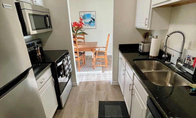 We welcome you to discover our plush designer linens and the convenience of having a full kitchen with dishwasher plus free-to-use laundry located inside the building. With free parking next to the unit, you have everything within reach.