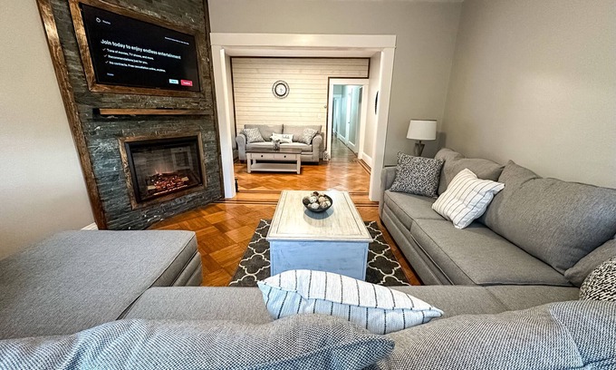 The living room has a custom floor-to-ceiling fireplace with a 65' Smart TV. There's a large 6-8 person comfy couch for everyone to relax and watch a movie. The additional sitting room