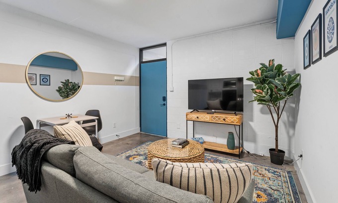 Enjoy a boutique hotel experience in a studio apartment located in a beautifully restored 1964 building, fully remodeled in 2020. Each unit features similar but unique decor, with the same layout and amenities for a consistent stay.