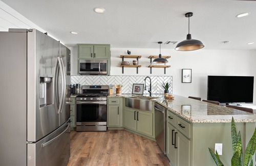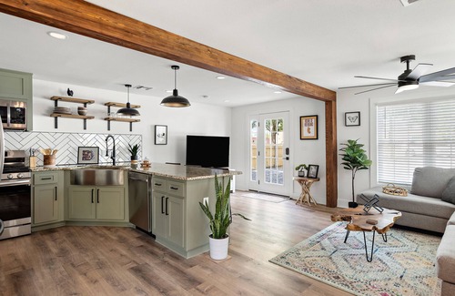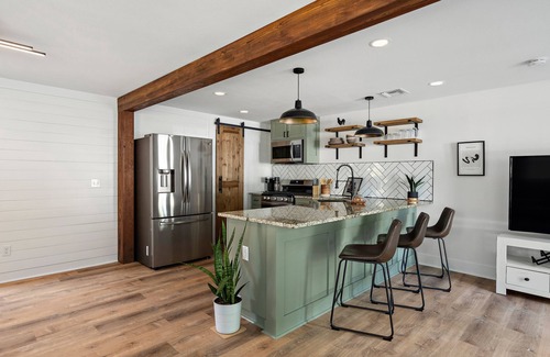 The kitchen is fully stocked with all modern appliances so you are ready no matter if you are dining in or eating out at over 20 restaurants nearby. Also included: Coffee station with complimentary coffee, few breakfast bars for on the go, a couple bourbons/tequila at the bar, as well as a few beers from our local brewery- Gnarly Barely!