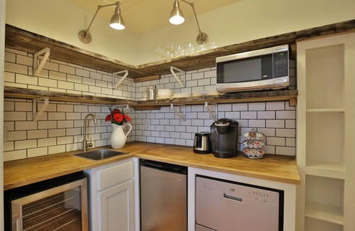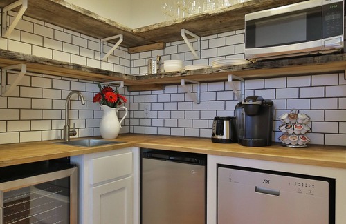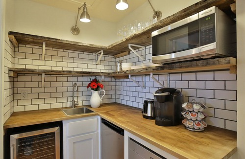 The kitchenette, hidden behind double doors, is equipped with an under-cabinet refrigerator and separate freezer, dishwasher, microwave and Keurig.