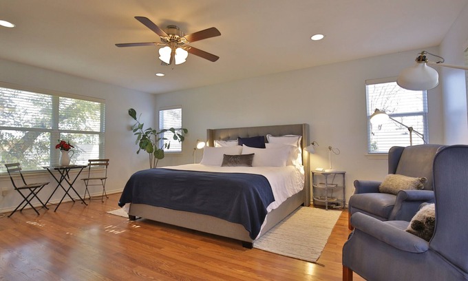 Our open-plan apartment suite is situated behind Eleven09, our main house vacation rental, and sits above a two-car detached garage. It is just the right size for an individual on business or a romantic couple's getaway. Come see why reviewers call it, "better than any hotel in all of Abilene!"