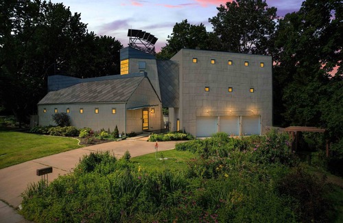 Designed & built by Dan Rockhill, distinguished professor of architecture at KU, the Epard/Porsch house features sculptural stone, steel, & glass elements that bring abundant sunlight into modern living spaces.
