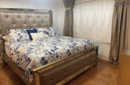 The luxurious master suite is a true haven, complete with a California King bed, a private living area with a sleeper sofa, a workspace/makeup bench, and a spa-like bathroom with a tile shower and soaking bathtub. Additional AC window unit to for your comfort.