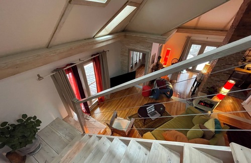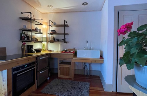 This luxury loft apartment has french doors opening onto a large treetop level deck overlooking a garden with pond and stream. It is in the heart of downtown Fairfield, a block away from the grocery store and 5 blocks from the town square. I (the owner of this 4 apartment building) am an artist and I designed this apartment for myself. It is both wonderful and a bit eccentric. The space is entirely open. but there is a part of the loft that forms a second room that is quite private; both visually and aurally separate from the rest of the space. Most adults have to bend over to enter the space. Check out the photographs. The deck has steps down to the garden which you are free to enjoy. Residential neighborhood. The house borders on an alley that has the feeling of a country lane. Easy peasey.... Half way between the town square and the university. One block down a country lane feeling alley to the grocery store. Easiest location. Free bikes for getting around or enjoying the 17 mile bike loop around Fairfield. All revenues will go toward welcoming refugees to Fairfield. Free bikes to explore Fairfield and the beautiful 17 mile bike loop that circles the town.