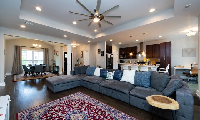 The home sleeps a total of 14 guests. With 4 bedrooms and 3 bathrooms, it can accommodate the whole family. There are 4 TVs in the home, 1 in the master, and 1 in both guest bedrooms downstairs, with one large TV in the living room for all the family and friends to gather around. The kitchen has modern touches and marble countertops for that luxury feel, it all comes equipped with a Keurig coffee machine, Kitchen aid stand mixer, instant pot, 4 burner stove with griddle, and anything else you may need for this to feel like a home away from home.