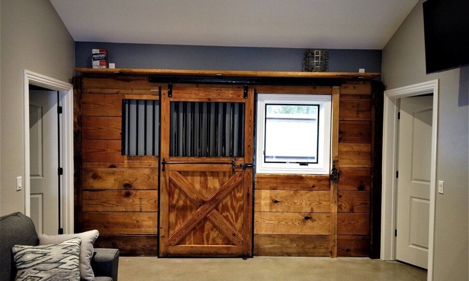 Enjoy the 25,000 pound outdoor stone Community bar beside the 7' gas fire pit. We have a magnificent 9'x125' stamped covered porch with Adirondack chairs. We have over 600,000 tons of beautiful rock from Southern Oklahoma inside the fence for your safety. The entire Villa has a 7' tall x 1200' steel privacy fence with an amazing stone lighted entry gate. We have 24x7 Camp host located at the front gate. We have 20lb fire extinguishers, egress windows, smoke alarms, 5 carbon monoxide alarms, 6 motion sensing lights and first Aid boxes. We have installed a heavy pipe fence to make safe play area for kids and adults. A one of a kind feature in the building design has 6 inches of Spray foam insulation on all the exterior walls, 4" of interior wall insolation and solid core doors to eliminate the outdoor noise for a good nights sleep. The high-end mattresses are made in Kansas and the high-thread count sheets are designed to keep you cool. The custom built hand made Amish beds were made from 6,000 pounds of Cherry wood from Ohio. The Amish hand crafted kitchen cabinets lumber was harvested in Missouri and built in Kansas. The massive custom built live edge walnut table was crafted in Kansas. The bathroom double bowl designer sinks were designed and poured in Kansas City. The amazing tile work in the showers took over 200 man hours 6'x6'x9' double shower heads. The bathroom has a bidet and urinal. The Artist was from Kansas City they painted 12x12 mural they poured over 120 hours into each mural. The Villa was built using the most efficient heating & air, 100% LED lights, automatic switches and preset Thermostat controls. The floors were polished to a 1200 abrasive using high-grade diamond tooling to a glossy mirror like finish. This step by step process took 3 highly skilled men 6 days to complete. The restored stables used as décor once held race horses in Tiffany Springs Missouri.