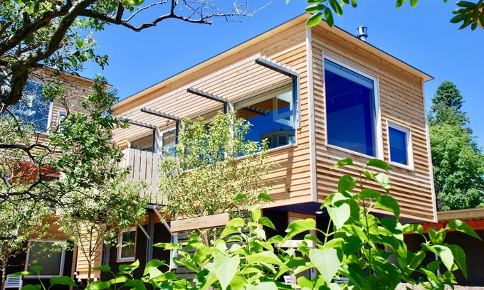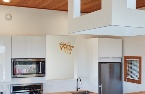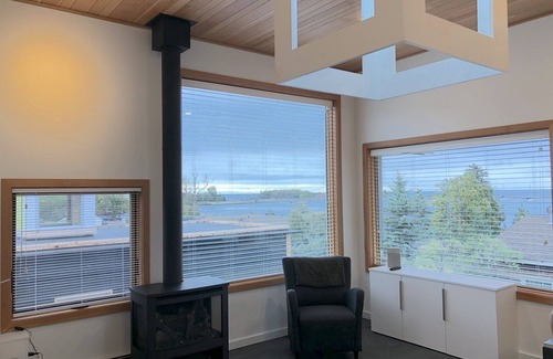The Aurora is a free standing home in the heart of Grand Marais near the harbor. Designed by celebrated Minnesota architect David Salmela and newly constructed in 2018/19. This collection of modern homes has been featured in Mn. Monthly, Midwest Home, Arch Daily, and other publications around the globe. We have even won awards for this architecture as far away as Sweden. The Aurora is the smaller sister to The Sky House and the Horizon, two sibling properties to Aurora in the exclusive enclave called "tre søstra" which means "three sisters" in Danish. Aurora is one bedroom, one bath, plus a very nice sleeper sofa for one adult or two children, and floor bed for one. There is a roomy main living space that seems to float above the area buildings and has wonderful view of the harbor, the town, and Lake Superior. Although designed ideally as an upscale oasis for two, 4 people can stay here in a pinch. The Aurora provides an inspiring modern space that allows for privacy among those sharing the lodging, and also provides a captivating view from the great room area on the top floor of the Grand Marais harbor, the neighborhood, and the town close by. She has a desk area in the bedroom, a walk out blue stone patio from the bedroom, a planning desk in the hall, an all tile bathroom with walk in shower, a large entry area, a full laundry, a beautiful flight of stairs to the upper level, a balcony, panoramic windows, fully modern kitchen with top of the line appliances, lighted drawers and butcher block countertops; dining for 4 with 6 possible, a custom sofa that sleeps one adult, or two children, a custom floor bed for one, and a gas fireplace. Everything is in walking distance from our little micro community in the heart of Grand Marais. Every restaurant, bar, coffee shop, gallery and Grand Marais' famous beach are all within a very short stroll from your private residence. The home is designed in modern Nordic fashion based on the original Stabur design- a work building commonly seen in Northern Europe. This design culminates a timeline of Scandinavian and Nordic design that the Miller's began on the property next door that also honored northern work buildings in the roots of their designs. There is off street parking under a car port. There is an electric car charging station in the carport as well. There is a fully modern and capable kitchen, an architect designed built in sofa and contemporary gas fireplace. Note the unique skylight with modern light treatments and the push button electronic pop up television that you can leave hidden if you wish. There is also a balcony. The entire home has slate floors and modern cabinets. There is a utility room with full size washer and dryer. Everything about The Aurora is designed with environmental sustainability in mind. These homes have an incredibly small footprint both structurally and environmentally. The foundations were designed to take up as little of the yard as possible- by being small at the start and increasing as you go up just like the old Stabur upon which this design is based. The energy efficiency is profound because these are composed of structurally insulated panels which are incredibly efficient. No cost has been spared to make the Aurora the highest quality, most significant architectural addition to Grand Marais' beautiful landscape. We hope you will find it warm, welcoming, and a once in a lifetime experience in one of the world's most magical places. We have written a detailed guide to what we consider the most special "secret" places in the area. You can pick and chose your own adventures with it for reference depending on your tastes and the weather. That guide is available to you inside the home and also sent out via links to videos. Sauna is available on a first come first served basis for an extra fee and is Thanks so much for staying with us! As a returning customer please consider booking direct next time for the lowest possible price and best possible communication tools. Hopefully you saved our direct website info, otherwise our phone number will help us direct you there. If not, just try to find us on the web. Cheers and thanks again! Todd and Susan and can be booked on our direct site- message owner to verify availability prior to completing your reservation.