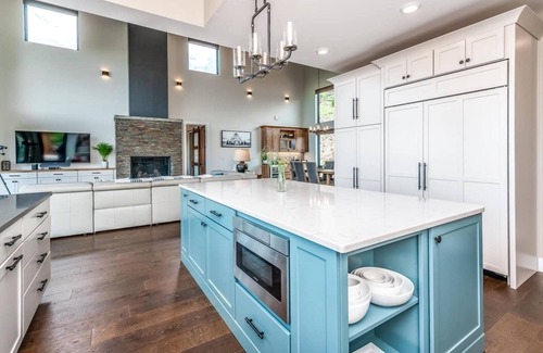The gourmet kitchen features a 6-burner dual oven range, granite countertops, and modern appliances. A large island with seating for four and a dining table allow everyone to share meals together. Coffee lovers will appreciate the French press, grinder, and combination Keurig/drip coffee maker.