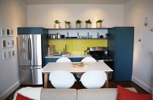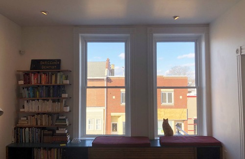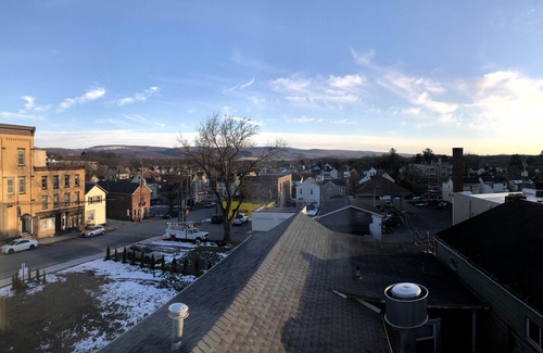 The loft is located on the second and third floors of a historic building on the main street of quaint Blairsville. It’s just above Market Street Pastries, so you’ll enjoy the smell of fresh baked goods from the loft! On the second floor you’ll find an open-plan kitchen and living room with massive windows and a sofa bed. The sun-drenched second floor also has a a workspace and a bathroom. Enjoy panoramic views of the mountain range from the third floor in this serene, minimalist space.