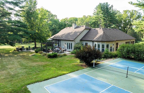 Welcome to The Baraboo Hideaway! This luxurious retreat near Wisconsin Dells has it all: a game room, hot tub, and even a home theater. Stay active with the gym, pickleball court, and ultimate frisbee field. Relax, recharge, and enjoy endless entertainment with family or friends. Book your stay at the Baraboo Hideaway and immerse yourself in nature and tranquility! We can’t wait to welcome you!