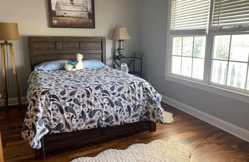 Queen bed across the hall from the full shared bathroom. Many describe this is an “experience” or “retreat” vs. just a room rental. You MUST be okay with dogs and birds. I try my best to keep them away and quiet, but things happen. Most visit the Parkton Place for some furry love.