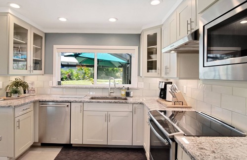 The home is perfectly set up for two couples or families to have their own private space. Guest Suite features a full kitchen: stove, microwave, fridge, utensils, plates, cups, and a dining table for 4.