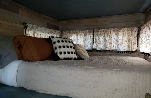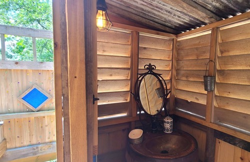 This one-of-a-kind ZEN Garden, glamping spot, The Bath House will not disapoint you. If it's the outdoors you love, then, this vintage 1964 camper situated under a covered patio and huge beautiful mature trees and surrounded by a very unique artistic one-of-a-kind fence. With a beautiful out-door kitchen, ice maker, frig/freezer and plenty of seating for entertaining or relaxing. You'll enjoy a huge 6ft soaking tub and a rain head shower as you relax in the evening while gazing at your fire on the deck.