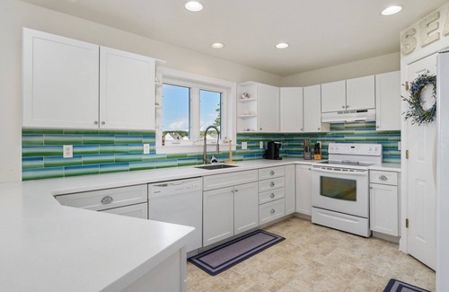 With gleaming hardwood floors and tons of natural light, The Baywatch Bungalow is warm and welcoming. Kick up your feet in the beachy Living Area - sink into the inviting sectional sofa and enjoy Satellite TV and Free WiFi. The wonderful open layout is perfect for spending time together without ever feeling crowded, and you can enjoy the views from many windows facing the water. There is a convenient Half Bath adjacent to the Living Area, as well.