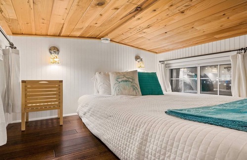 A fixed ladder with generous steps leads up into the cedar-lined loft that creates a cozy canopy over the queen-sized bed out-fitted with luxury linens. In the bathroom, a glass vessel sink floats above a bed of sand and seashells, and nautical-inspired touches - like mermaids, oars and rope - add to the true coastal charm of the space.