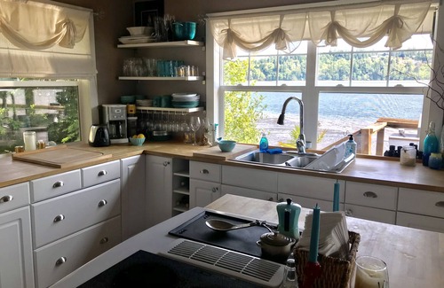 Walk outside the two, double French doors onto the large deck and enjoy the 'outside living room' furnished with beautiful furniture, rugs, umbrella and a table fireplace. Barbecue from the deck as you enjoy the views or simply cook inside where the water is always in sight.