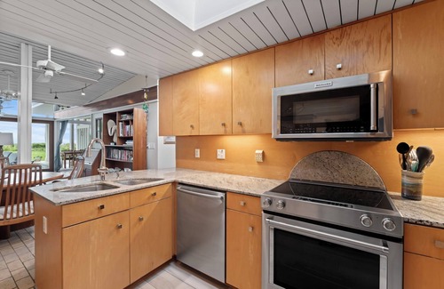 The Beach Suite has approx. 1100 square feet of living space with an open-concept floor plan, with living room, dining area, and wood burning fireplace. The living room is furnished with a 3-seated leather couch and classic teak furniture and teak dining table that can sit up to 8. The living room offers an additional murphy bed for extra sleeping space. The oceanfront bedroom has a queen bed and a pocket door to separate it from the rest of the living space. The master bath was totally remodeled and features a freestanding heated jet bathtub, separate shower, and separate toilet room. The second bedroom has a Murphy bed, love seat, kitchenette and full bath with tub/shower, and a separate entrance.