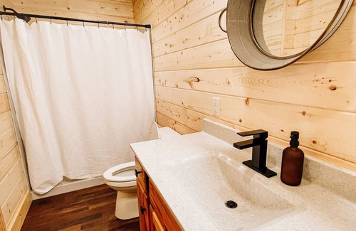 The Bear Cabin is perfect for families and group travelers, offering comfort and convenience by a peaceful half-acre pond. It accommodates up to 6 guests with two queen bedrooms and a queen pull-out couch in the living area with one full bathroom. Enjoy a full kitchen, coffee bar, washer/dryer, and a cozy gas-powered fireplace.