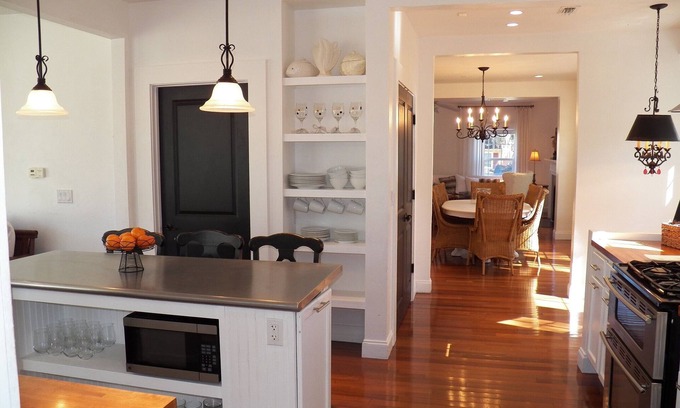 Large working kitchen with stainless island, double ice-maker refrigerator, pantry, gas range open to family room, living room and dining area (seats 6 - 12 comfortably)
