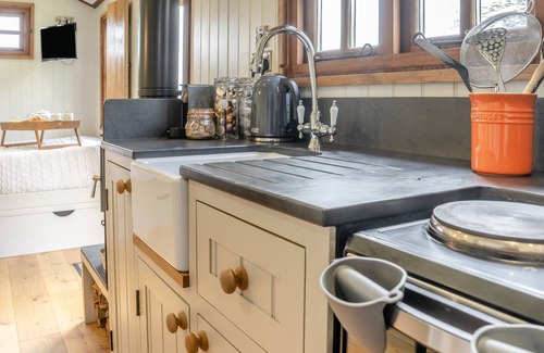 Part of a group of three cheerful shepherd’s huts, this bright and inviting hideaway sits in a peaceful location along the northern edge of the Bannau Brycheiniog (Brecon Beacons) National Park. Perfect for exploring the glorious Black Mountains, the property is ideal for walkers, climbers and nature lovers discovering the area’s majestic scenery. Dating back almost a thousand years, the medieval Castell Bronllys sits just 150 metres from the site. A half-mile stroll will take you to Bronllys, where you will find a welcoming choice of places to eat and drink. The surrounding area has a wealth of attractions including Llangorse Lake, The Begwyns, and the nature reserves at Pwll y Wrach and Brechfa Pool (all within 10 miles). Hay-on-Wye (7.5 miles) is known for its fantastic selection of second-hand bookshops, while the popular market town of Brecon (8 miles) rests alongside the River Usk and is home to a Gothic cathedral. A short flight of four external steps leads up and into this light and inviting shepherd’s hut with wooden floors and panelling, and a high curved ceiling. Once you’re inside, a traditional wood burner sits just by the door, which combines with the underfloor heating to offer a warm and welcoming holiday base. Find the compact but well-appointed kitchen space to one side, offering all that’s needed to cook up a holiday meal, which can be enjoyed inside at the table, or al fresco-style out in the garden. At the end of each busy day away, retire to the inviting king-size bed, where a handy Smart TV invites relaxing evenings and lazy mornings. Completing the interior is a well-equipped shower room. Heading back outside, the peaceful garden area is an ideal space to settle back, dine alfresco and unwind in the bubbling hot tub. The private patio also has a choice of outdoor furniture and a fire pit, perfect for enjoying a BBQ on a sunny afternoon. Off-road parking is available for two cars.