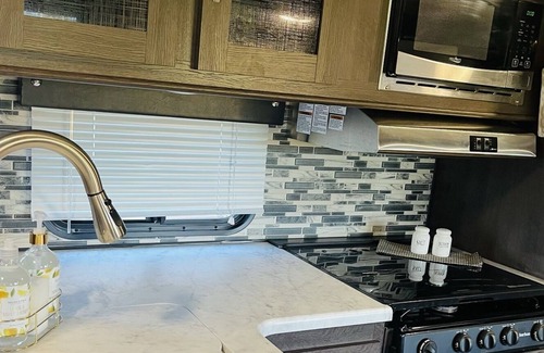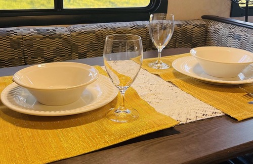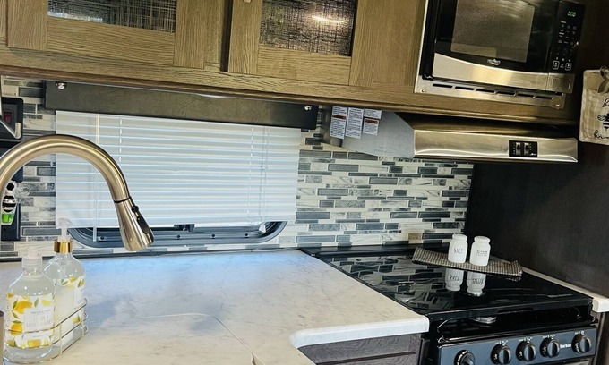 Enjoy this peaceful RV located in a park like setting!!! Have a glass of wine outside at the fire pit or snuggle up inside for a movie. Our like new, modern unit with lovely finishes won’t disappoint!
