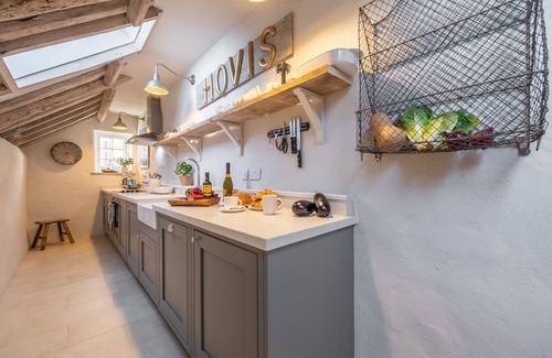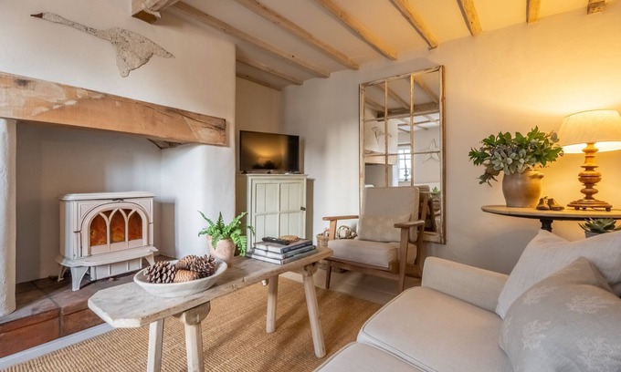 Completely renovated to a high standard in 2022, the cottage is beautifully appointed with emphasis on a calm colour palette that compliments the sophisticated country styling. Curated using a mixture of antique and restored furniture, the aura of the cottage is relaxed and ultra comfortable. Curved walls, bleached oak beams, vaulted ceilings and delicate muted details calm the soul. The streamlined galley kitchen provides plenty of Quartz worktop space creating the ideal stage for any enthusiastic chefs to rustle up a meal using delicious local produce. Two separate seating areas are available. The sitting room features a large comfortable sofa set in front of a charming inglenook fireplace with wood burning stove, and the garden room with additional seating overlooks the lawn to the rear of the cottage. Smart televisions are provided in each of the rooms. A delightful spacious dining room provides seating for up to four guests around a farmhouse table. As is traditional for properties of this era, a bathroom is situated on the ground floor. Here a smart and contemporary shower room features a walk-in shower.