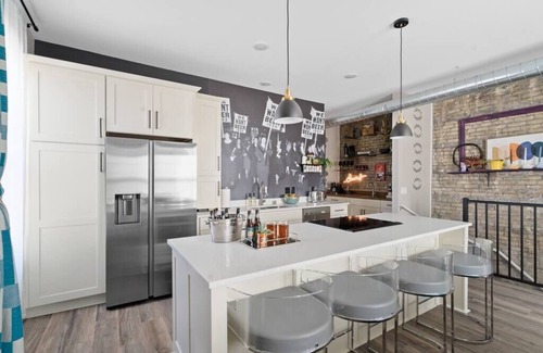• Open concept kitchen/living room provides ample space to play board games, watch the 65” 4K TV, or cook meals in the full kitchen with stainless steel appliances and non-stick pans. Enjoy complimentary coffee/tea and fast Wi-Fi in the heart of the Historic Walker’s Point neighborhood.