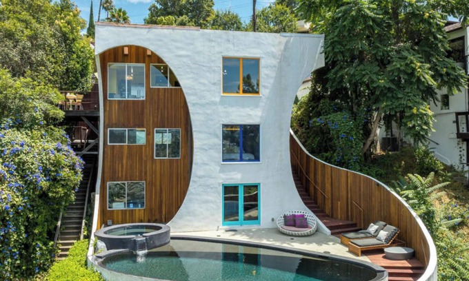 The renovation was completed in 2008 (refurbished in 2025) revealing Haeg's indoor/outdoor design integrating the adjoining Hollywood Hills landscape. Each of the three stories are treated with bright and vibrant paint colors that transition downstairs in muted tones creating a calm and grounded atmosphere. Emerging organically from the walls, built-in seating throughout appears as natural rock formations while peering through circle windows into the solarium. The exterior elevation features a rocket-like silhouette with wood siding and a stucco facade which contains mica dust sparkles that glisten when viewed from different angles.